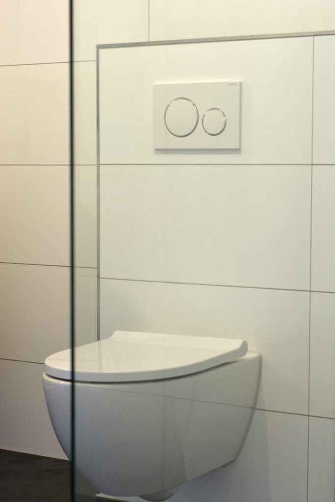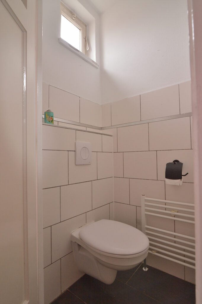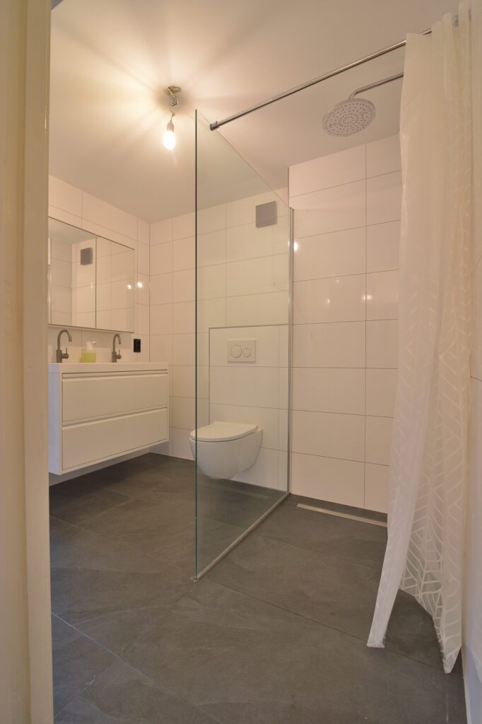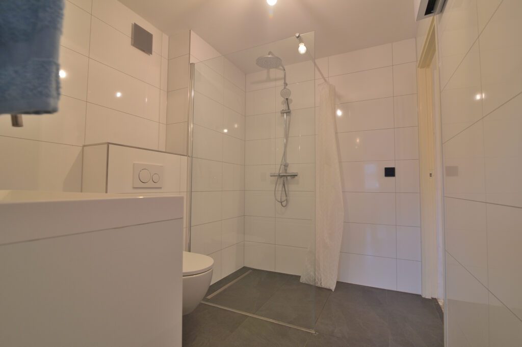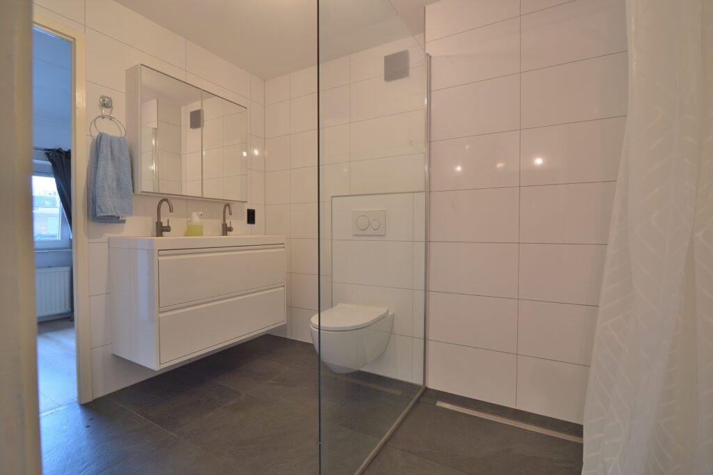 De moderne badkamer (2024) is luxe betegeld en is voorzien van een brede inloopdouche, dubbele vaste wastafel in badmeubel en en tweede toilet (wandcloset).