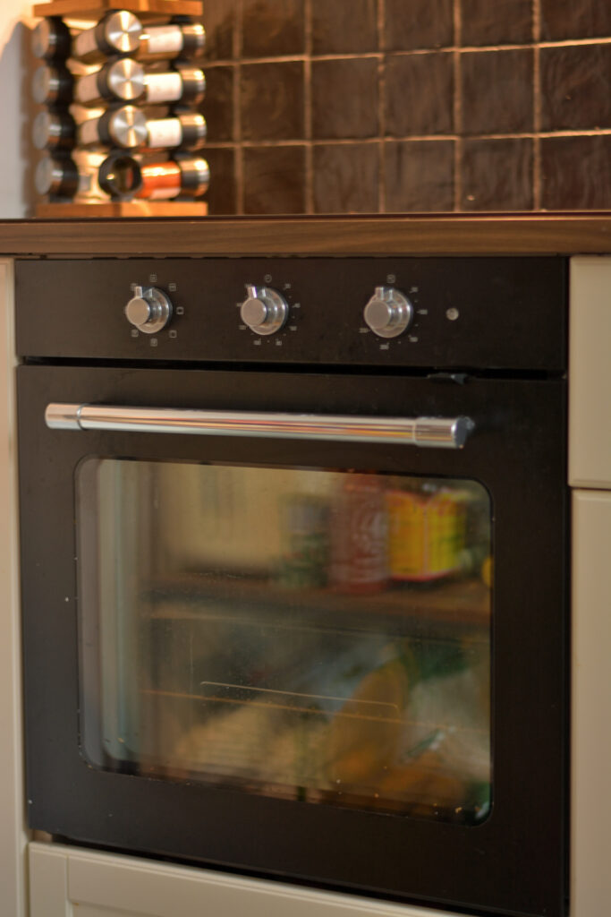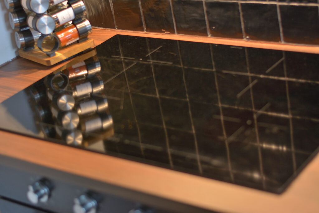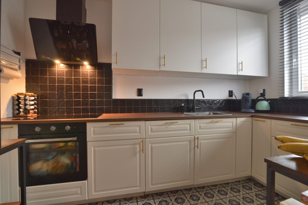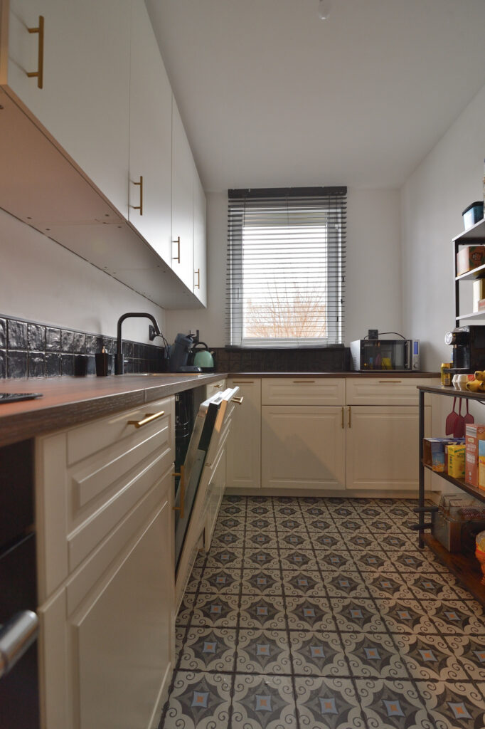 De gesloten (leef-)keuken 3,55 x 2,17 m. is voorzien van een moderne keukeninstallatie in hoekopstelling, met heteluchtoven, 5 velden inductiekookplaat, design afzuigkap, vaatwasser en ruim voldoende bergruimte in ladeblok en kasten.