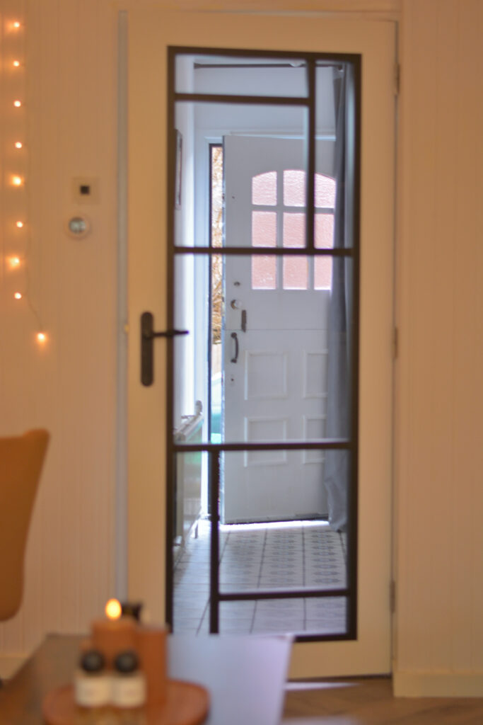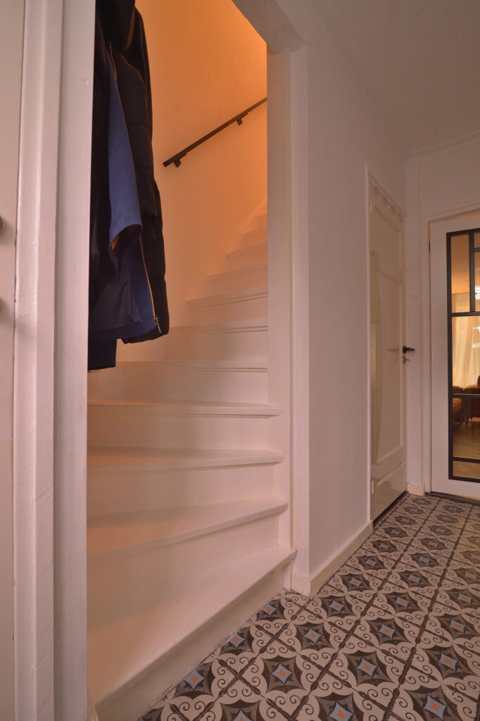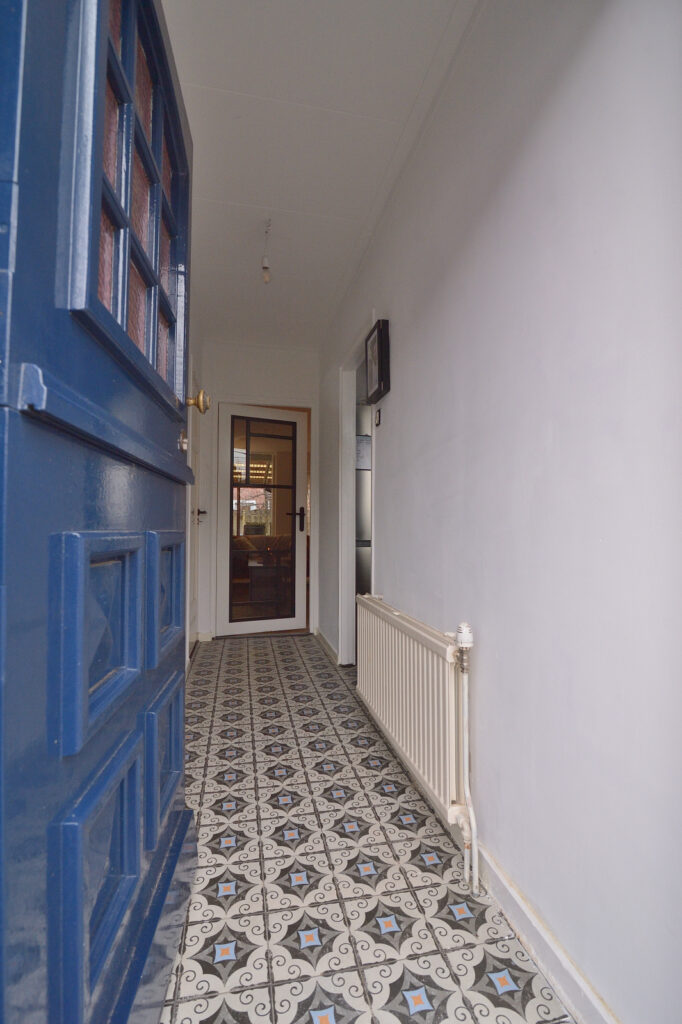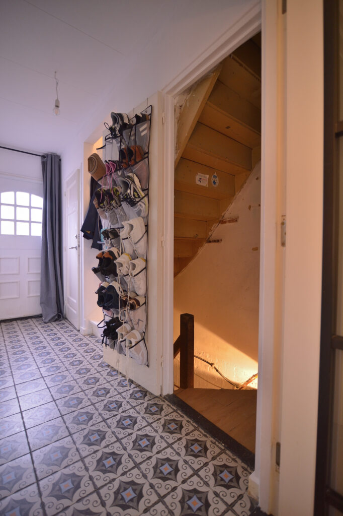 De fraai betegelde gang biedt toegang tot de meterkast (geheel modern, 8 groepen, 2 fasengroep, 2 aardlekschakelaars, 1 groep voor de 8 zonnepanelen en de hoofdschakelaar), het betegeld toilet met wandcloset, het trappenhuis, de keuken en de woonkamer.