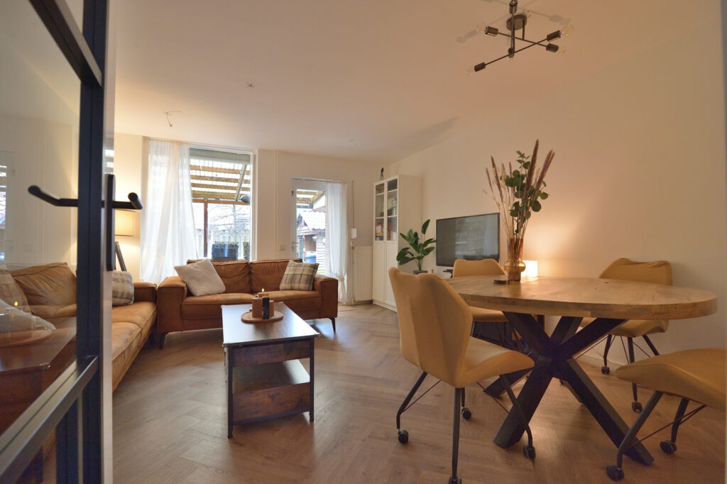 De woonkamer ca. 5,01 x 4,24 m. is voorzien van een fraaie visgraat laminaatvloer en heeft een openslaande deur naar de tuin. Hier is er ook een aansluiting voor een hout-/pelletkachel (d.m.v. moderne RVS dubbelwandige rookgasafvoer).