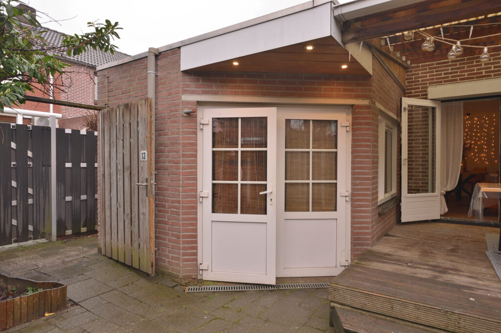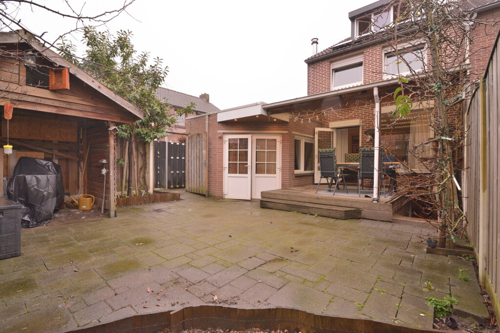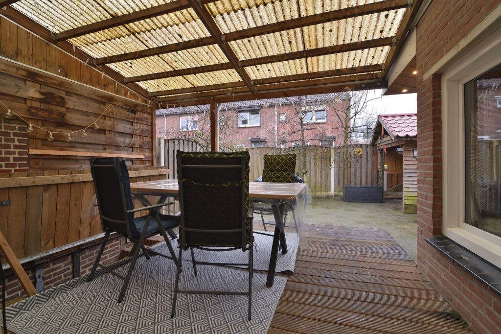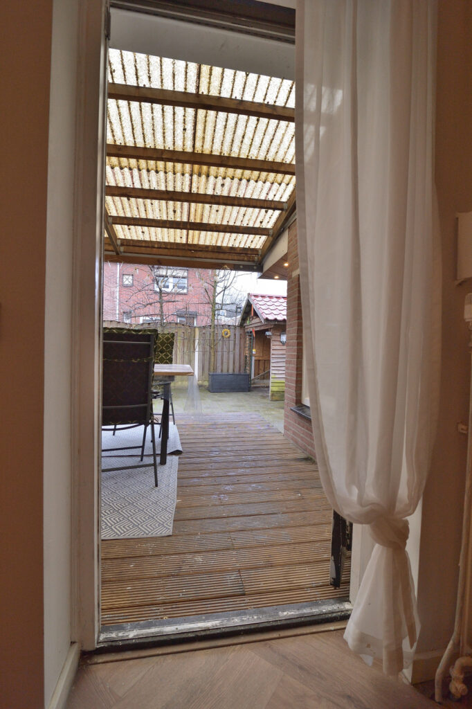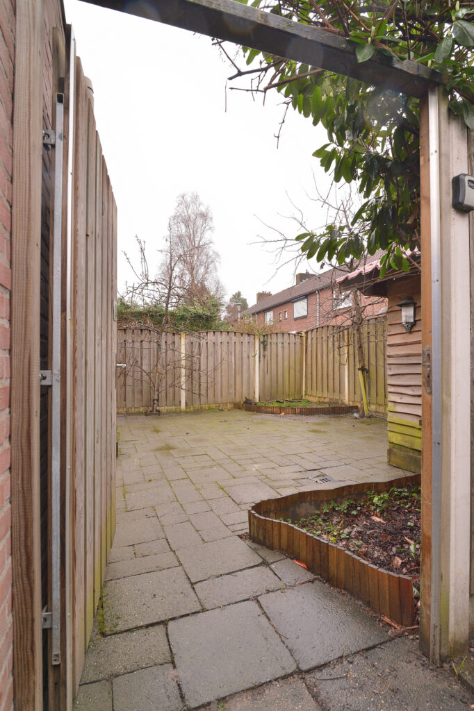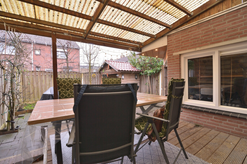 De geheel omsloten tuin ligt op het zuiden en heeft een mooi, overdekt vlonderterras 3,37 x 3,93 m. met een luik naar de keldertrap, een tuinberging ca. 6 m² en er is toegang tot de zeer ruime garage met werkplaats (mogelijke hobby- of kantoorruimte) via de dubbele openslaande deuren.