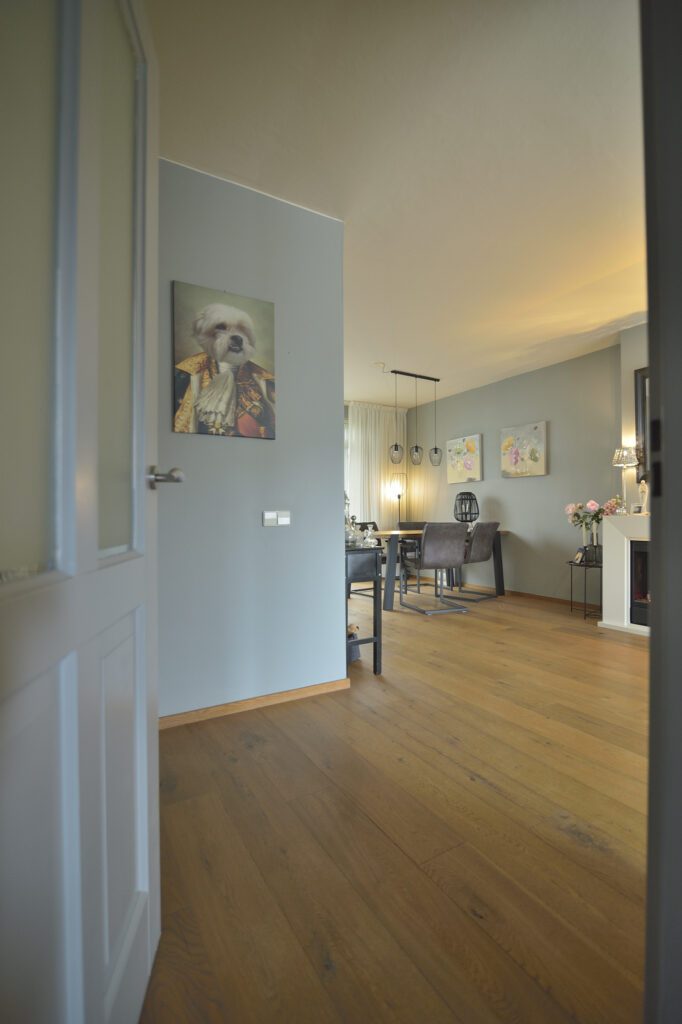 In de welkomsthal/gang is er toegang tot de meterkast met 3 fasenaansluiting, 9 groepen, 4 aardlekschakelaars, teruglevergroep en slimme meters. Hier bevindt zich ook het betegeld toilet met wandcloset, de garderobe en is er toegang tot het trappenhuis en de woonkamer.