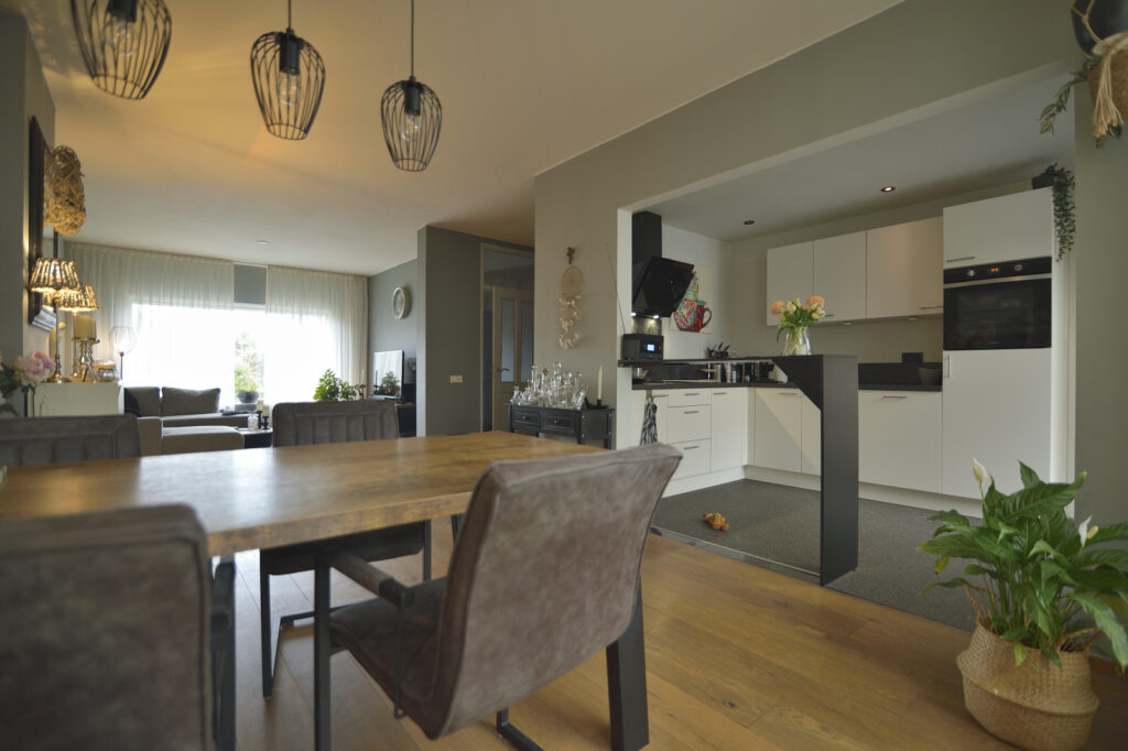 De keuken 3,66 x 2,46 m. staat in halfopen verbinding met de woonkamer. Hier is de de moderne keukeninstallatie (2021) in hoekopstelling geplaatst, voorzien van inductiekookplaat, design afzuigkap, vaatwasser, heteluchtoven, koelkast en ruim voldoende bergruimte in kastjes en ladeblok.